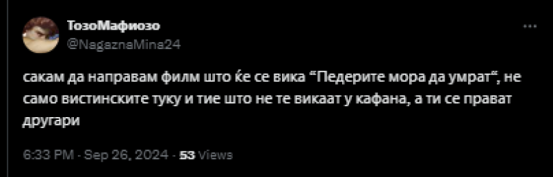На ден 26.09.2024 година, во 18:33 часот, регистриран е говор на омраза врз основа на сексуална ориентација и родов идентитет од твитер профилот @NagaznaMina24. Во постот пишува „сакам да направам филм што ќе се вика “Педерите мора да умрат“, не само вистинските туку и тие што не те викаат у кафана, а ти се прават другари“.