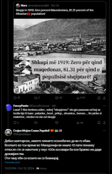 На ден 15.10.2024-та година, во 22:03 часот, објавен е говор на омраза врз основа на етничка припадност како коментар од твитер профилот @StojkoMojov. Авторот пишува „Дебил шиптарски, лажете племето козоебачко да ви го ебам. Воопшто во тоа време во Македонија ве имало 10 пати поналку отпосле сте се накотиле у плус 100к косовари ба кои Бранко им даде државјанства. Оти таму еби си козите на се бламирај“.