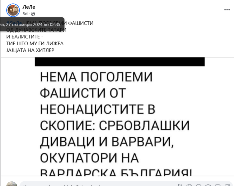 На ден 27.10.2024 година, во 02:35 часот, објавен е говор на омраза врз основа на етничка и национална припадност, како фејсбук објава на фејсбук страната @ЛеЛе @. Во фејсбук објавата пишува: „#ЛеЛе НЕМА ПОГОЛЕМИ ФАШИСТИ