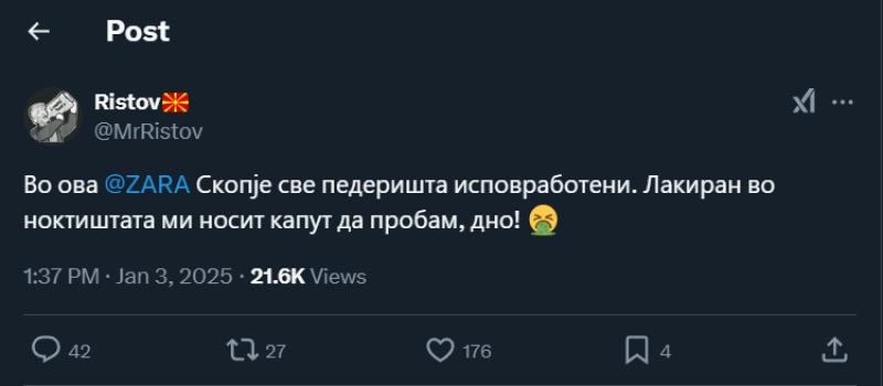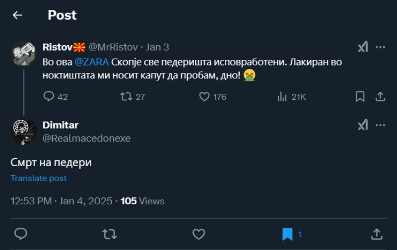 На ден 04.01.2025 година X профилот „@MrRistov“ , на својот профил, напиша: „Во ова @ZARA Скопје све педеришта исповработени. Лакиран во ноктиштата ми носит капут да пробам, дно!“. Во оваа објава, корисникот користи говор на омраза насочен кон припадниците на геј заедницата, преку зоборот „педеришта“. Во коментарите, под објавата, Х корисникот „@Realmacedonexe“ напиша: „Смрт за педери“, со употреби говор на омраза насочен кон припадниците на геј заедницата, а ,воедно, говорот на омраза го дополни и со повик на насилство.