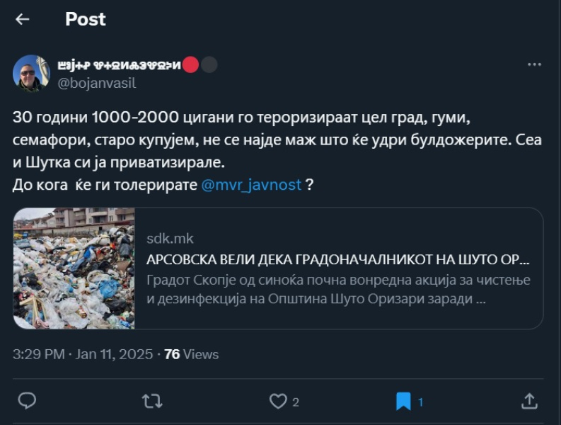 На ден 11.01.2025 година, X профилот „@bojanvasil“ објави вест од медиумот „Сакам да кажам“ во кој се зборува за вонредна акција за чистење во скопската општина Шуто Оризари, организирана од Град Скопје. Напомена: Шуто Оризаро е скопска населба со претежно население од ромска етничка припадност. Во прилог на објавената вест, Х корисникот напиша:„ 30 години 1000-2000 цигани го тероризираат цел град, гуми, семафори, старо купујем, не се најде маж што ќе удри булдожерите. Сеа и Шутка си ја приватизирале. До кога ќе ги толерирате @mvr_javnost?“. Со ваквата објава, корисникот користи говор на омраза насочен кон припаднците на ромската етничка заедница, преку зборот: „цигани“.