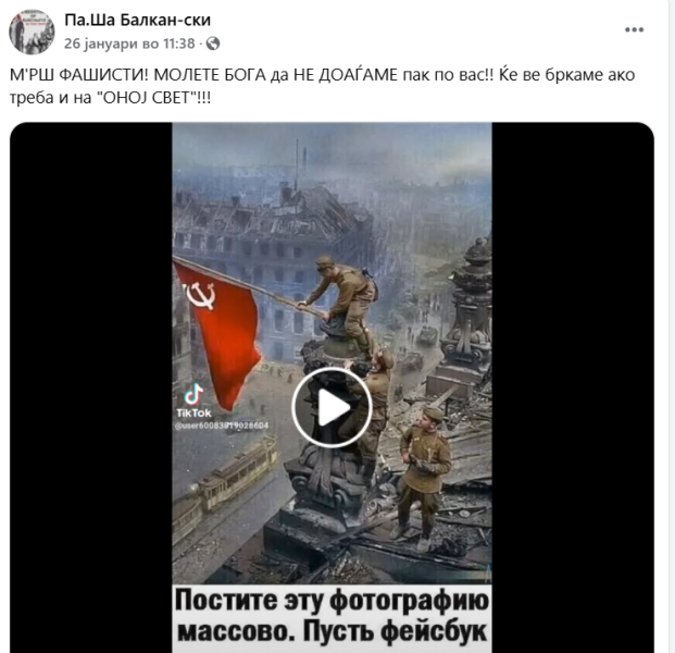 На ден 26.01.2025 година, во 11:38 часот, објавен говор на омраза врз основа на етничка и национална припадност, како фејсбук објава во фејсбук група @НАШАТА РОДИНА МАКЕДОНИЈА, од страна на фејсбук профилот @Па.Ша Балкан-ски. Во фејсбук објавата пишува: М'РШ ФАШИСТИ! МОЛЕТЕ БОГА да НЕ ДОАЃАМЕ пак по вас!! Ќе ве бркаме ако треба и на "ОНОЈ СВЕТ!!!“