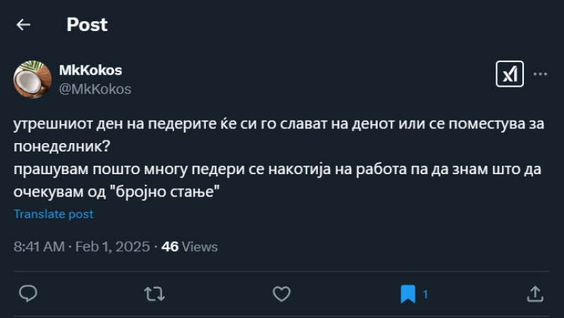На ден 01.02.2025 година X профилот „@MkKokos“, на својот Х профил, напиша: „утрешниот ден на педерите ќе си го слават на денот или се поместува за понеделник? прашувам пошто многу педери се накотија на работа па да знам што да очекувам од "бројно стање"“. Со ваквата објава, корисникот користи говор на омраза насочен кон припадниците на геј заедницата, преку зборовите: „педерите“ и „педери“.