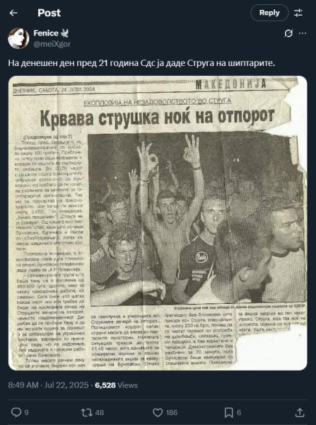 На ден 22.07.2025 година X профилот „@meiXgor“, на својот профил, објави слика од вест од дневниот печат „Дневик“, со наслов: „Крвава струшка ноќ на отпорот“. Во прилог на објавената слика, корисникот напиша: „На денешен ден пред 21 година Сдс ја даде Струга на шиптарите.“ Со ваквата објава, корисникот користи говор на омраза насочен кон албанското население, преку зборот: „шиптарите“.