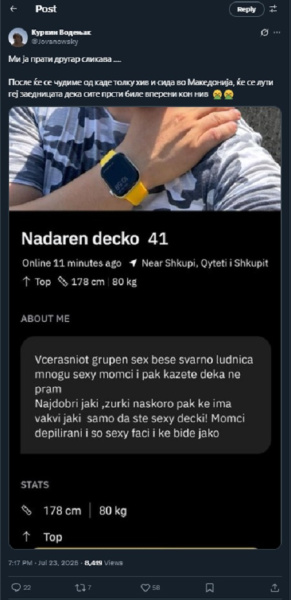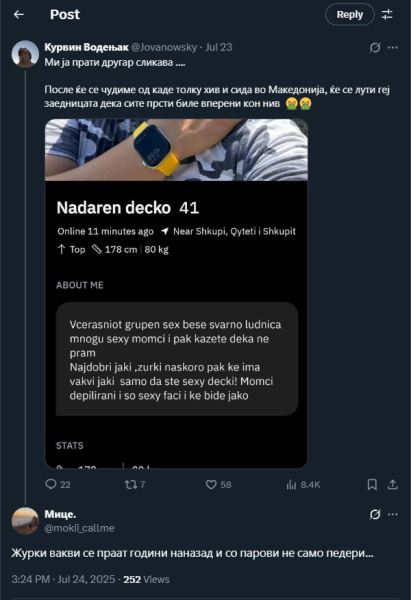 На ден 23.07.2025 година X профилот „@Jovanowsky“ објави слика од објава на дејт – апликација, во која се зобрува за организирање на групни еротски забави. Во прилог на објавената слика, корисникот напиша: „Ми ја прати другар сликава ....После ќе се чудиме од каде толку хив и сида во Македонија, ќе се лути геј заедницата дека сите прсти биле вперени кон нив.“ Во коментар, под објавата, корисникот „@mokii_callme“ коментира: „Журки вакви се праат години наназад и со парови не само педери...“ Со ваквиот коментар, корисникот користи говор на омраза насочен кон припадниците на геј заедницата, преку зборот „педери“.