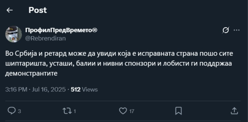 На ден 16.07.2025 година, X профилот на медиумот „@Rebrendiran“, на својот профил, напиша: „Во Србија и ретард може да увиди која е исправната страна пошо сите шиптаришта, усташи, балии и нивни спонзори и лобисти ги поддржаа демонстрантите“. Со ваквата објава, корисникот користи говор на омраза насочен кон албанското население, нарекувајќи ги „шиптари“.