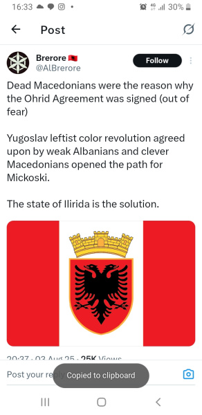 Постот во прашањеПостот, од 18:37 UTC на 3 август 2025 година, го вклучува следниот текст: "Мртвите Македонци беа причината зошто Охридскиот договор беше потпишан (од страв)