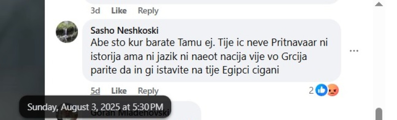 На ден 03.08.2025 година, локална штипска телевизија, „Телевизија M-Net HD“, на својот фејсбук профил, објави видео од колона возила како чекаат влез во соседната држава, Република Грција. Во прилог на видеото, медиумот напиша: „Километарска колона за влез во Грција на ГП Дојран“. Во коментар, под објавата, корисникот „Sasho Neshkoski“ коментира: Абе шо кур барате таму ејј. Тие ич не ве признаваат ни историја ама ни јазик ни нашата нација вие во Грција парите да им ги оставате на тие египци цигани“. Со ваквиот коментар, корисникот користи говор на омраза и нетрпеливост кон грчкиот народ, нарекувајќи ги „египци цигани“, како и кон припадниците на ромската етничка заедница, користејќи го изразот „цигани“.