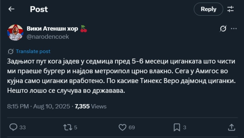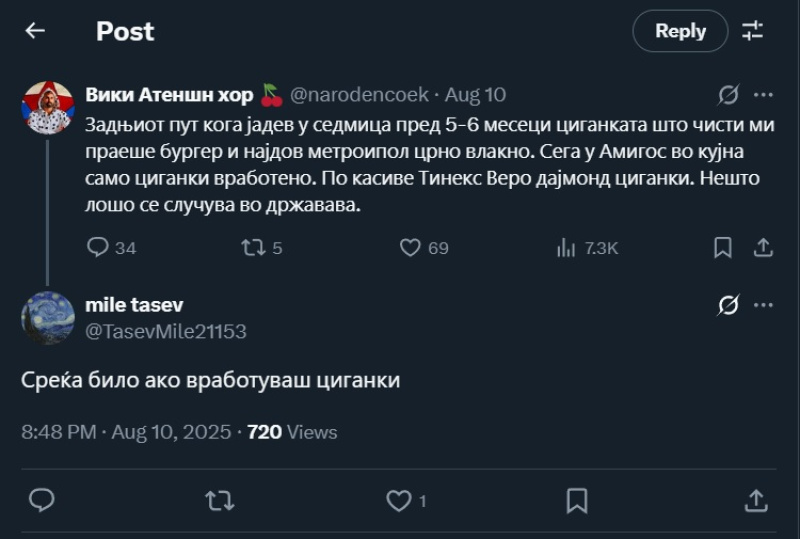 На ден 10.08.2025 година, на социјалната мрежа „Х“, корисникот „@narodencoek“ напиша: „Задњиот пут кога јадев у седмица пред 5-6 месеци циганката што чисти ми праеше бургер и најдов метроипол црно влакно. Сега у Амигос во кујна само циганки вработено. По касиве Тинекс Веро дајмонд циганки. Нешто лошо се случува во државава.“ Во коментар, под објавата, корисникот „@TasevMile21153“ коментира: „Среќа било ако вработуваш циганки“. И двајцата корисници употребуваат говор на омраза насочен кон припадниците на ромската етничка заедница, преку зборот: „циганки“.