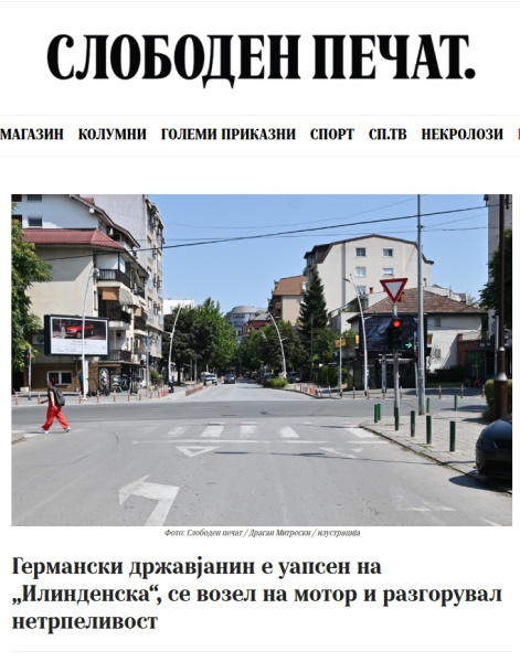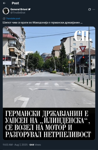 На ден 07.08.2025 година, националниот весник „Слободен печат“ објави вест на својата веб страна, насловена како: „Германски државјанин е уапсен на „Илинденска“, се возел на мотор и разгорувал нетрпеливост“. Х корисникот „@TinoBeBrat“ на својот „Х“ профил, објави слика од гореспоменатата вест, а во прилог на истата, напиша: „Шипот чим се врати во Македонија е германски државјанин ...“, со што употребува говор на омраза насочен кон албанското население, преку зборот „шипот“.