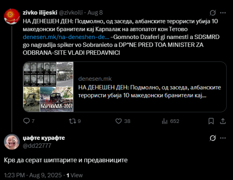 На ден 09.08.2025 година во 13:23 часот, од твитер профилот @dd22777 e забележан е говор на омраза поради етничка припадност. Авторот во коментар пишува „крв да серат шиптарите и предавниците“.