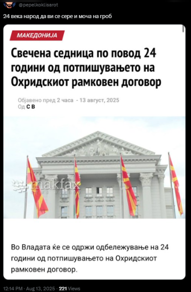 На ден 09.08.2025 година, во 13:23 часот е објавен говор на омраза врз основа на етничка припадност од твитер профилот @pepelkoklisarot. Тој пишува „24 века народ да ви се сере и моча на гроб“.