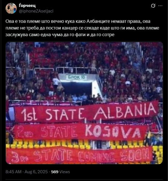 На ден 06.08.2025 година, во 08:45 часот е нотиран е говор на омраза поради етничка припадност од твитер профилот @iphoneZAseljaci.Во твитот пишува „Ова е тоа племе што вечно кука како Албанците немаат права, ова племе не треба да постои канцер се секаде каде што ги има, ова племе заслужува само една чума да го фати и да го сотре“.