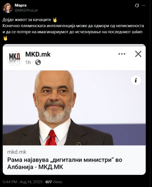 На ден 14.08.2025 година, во 17:44 часот, објавен е говор на омраза врз основа на етничка припадност од профилот @MKDProLet. Авторот пишува „Дојде живот за качаците. Конечно племенската интелигенција може да одмори од неписменост и да се потпре на имагинариумот до исчезнување на последниот шќип“.