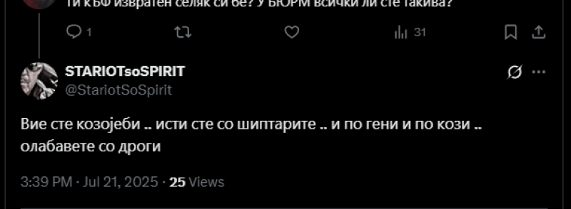 На ден 21.07.2025 година, во 15:39 часот е објавен говор на омраза врз основа на етничка припадност/национална припадност од твитер профилот @StariotSoSpirit. Во коментарот му реплицира на твитер профил од Бугарија во кој пишува „Вие сте козојеби .. исти сте со шиптарите .. и по гени и по кози .. олабавете со дроги“.