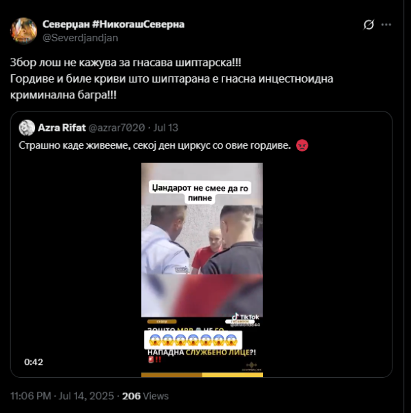 На ден 14.07.2025 година, во 23:06 часот, објавен е говор на омраза врз основа на етничка припадност од профилот @Severdjandjan. Во твитот е споделено видео од апсењето на напаѓачот на градоначалничката на Скопје, Данела Арсовска со следниот текст „Збор лош не кажува за гнасава шиптарска!!! Гордиве и биле криви што шиптарана е гнасна инцестноидна криминална багра!!!“