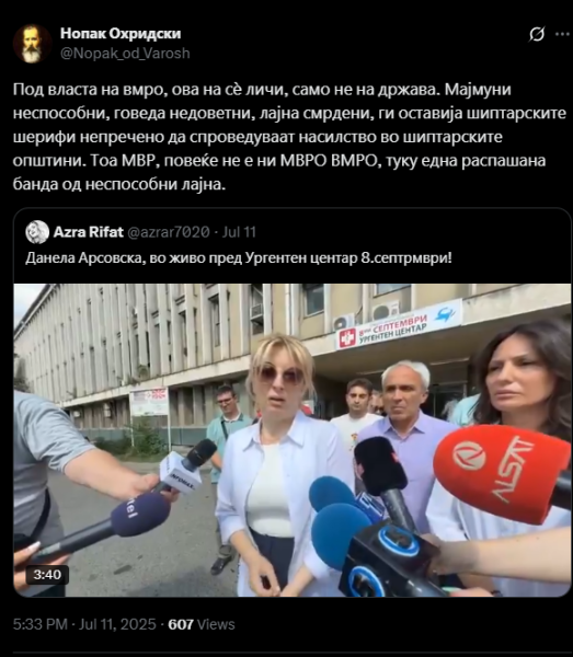 На ден 11.07.2025 година, во 17:33 часот, објавен е говор на омраза врз основа на политичка припадност и етничка припадност, од профилот @Nopak_od_Varosh. Авторот коментира „Под власта на вмро, ова на сè личи, само не на држава. Мајмуни неспособни, говеда недоветни, лајна смрдени, ги оставија шиптарските шерифи непречено да спроведуваат насилство во шиптарските општини. Тоа МВР, повеќе не е ни МВРО ВМРО, туку една распашана банда од неспособни лајна“.