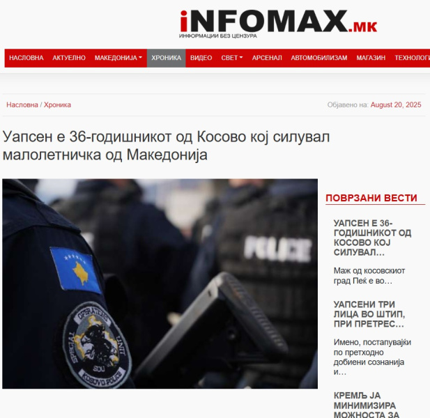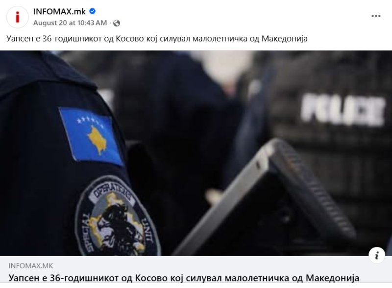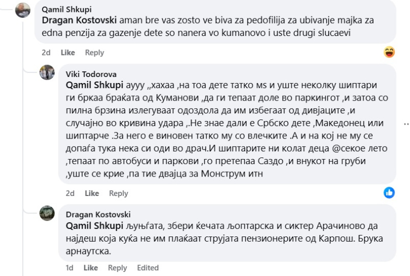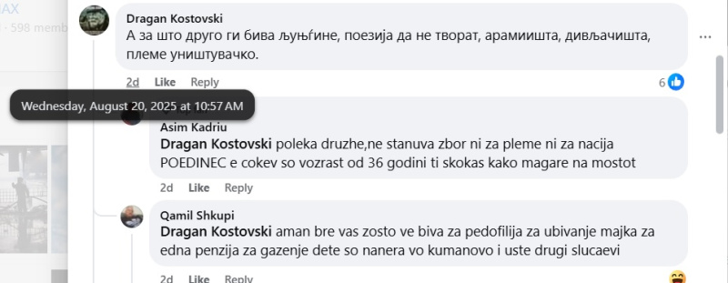 На ден 20.08.2025 година, медиумот „INFOMAX.mk“, на својата веб страна, објави вест насловена како: „ Уапсен е 36-годишникот од Косово кој силувал малолетничка од Македонија“. Истата вест ја објави и на својата фејсбук страна „INFOMAX.mk“. Во коментар, под објавата, фејсбук корисникот „Dragi Kostovski“ напиша: „ А за што друго ги бива љуњѓине, поезија да не творат, арамиишта, дивљачишта, племе уништувачко.“ Ваквиот коментар содржи говор на омраза насочен кон албанското население. На ова, корисникот „Asim Kadriu“ реплицира: „полека друже, не станува збор ни за племе ни за нација ПОЕДИНЕЦ е човек на 36 години ти скокаш како магаре на мостот“. Исто така, и корисникот „Qamil Shkupi“ реплицираше на „Dragan Kostovski“ со коментар: „амн бре вас зашто ве бива за педофилија за убивање мајка за една пензија за газење дете со намера во куманово и уште други случаеви“. Корисникот „Viki Todorova“ реплицира на корисникот „Qamil Shkupi“ со коментар: „ аууу ,,хахаа ,на тоа дете татко мѕ и уште неколку шиптари ги бркаа браќата од Куманови ,да ги тепаат доле во паркингот ,и затоа со пилна брзина излегуваат одоздола да им избегаат од дивјаците ,и случајно во кривина удара ,.Не знае дали е Србско дете ,Македонец или шиптарче .За него е виновен татко му со влечките .А и на кој не му се допаѓа тука нека си оди во драч.И шиптарите ни колат деца @секое лето ,тепаат по автобуси и паркови ,го претепаа Саздо ,и внукот на груби ,уште се крие ,па тие двајца за Монструм итн“, со што користи говор на омраза кон албанското население. Корисникот „Dragi Kostovski“ исто така, реплицира на корисникот „Qamil Shkupi“ со коментар: „ љуњѓата, збери ќечата љоптарска и сиктер Арачиново да најдеш која куќа не им плаќаат струјата пензионерите од Карпош. Брука арнаутска.“ Со ваквата реплика, повторно користи говор на омраза насочен кон албанското население.