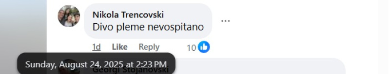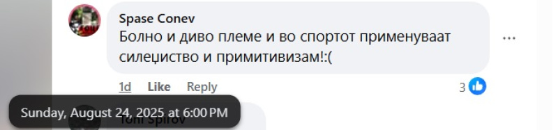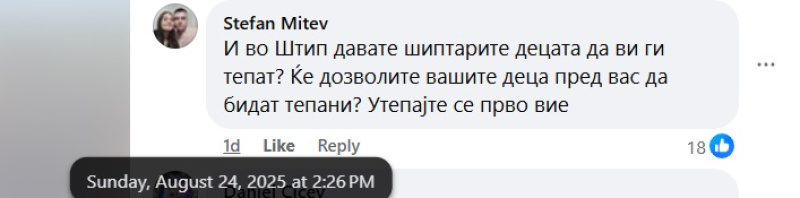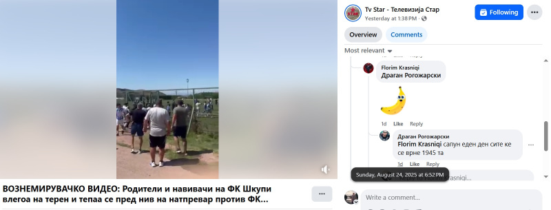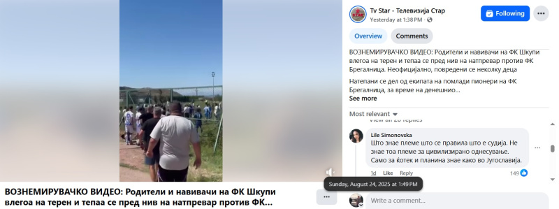 На ден 24.08.2025 година, локалната локалната штипска телевизија „Телевизија Стар“, на својот фејсбук профил „Tv Star – Телевизија Стар“, објави видео од инцидент на фудбалски натпревар меѓу пионерите на ФК Брегалница и Шкупи, кој се случи во Штип, на 24.08.2025 година, а во прилог на видеото, напиша: „ ВОЗНЕМИРУВАЧКО ВИДЕО: Родители и навивачи на ФК Шкупи влегоа на терен и тепаа се пред нив на натпревар против ФК Брегалница. Неофицијално, повредени се неколку деца Натепани се дел од екипата на помлади пионери на ФК Брегалница, за време на денешниот натпревар со ФК Шкупи од Скопје. Инцидентот се случил на теренот на Бело брдо,при крајот на второто полувреме,при водство на Брегалница од 2 – 1. Инцијална каписла за инцидентот бил моментот кога судијата му покажал црвен картон на еден од играчите на ФК Шкупи. Во тој момент на теренот влетал родителот на исклученото дете и со клоци и тупаници се нафрлил на еден од играчите на ФК Брегалница. Неговиот пример го следеле уште неколку родители на гостинските играчи. Во тој хаос, раководството на помладите пионери на Брегалница успеале да ја смират ситуацијата и натпреварот бил доигран, и резултатот останал, Повикана била и полиција, а на местото на настанот излегол и дежурен јавен обвинител од ОЈО Штип. Истрагата за инцидентот е во тек.“ Во коментар под објавата, корисникот „Lile Simonovska“ коментира: „Што знае племе што се правила што е судија. Не знае тоа племе за цивилизирано однесување. Само за ќотек и планина знае како во Југославија.“ Забележан е говор на омраза кон албанското население преку зборот: „племе“. Корисникот „Драган Рогожарски“ коментира: „Абе згази ги како пикавци, да не и текне Штип на мапа да го барат.“ Корисникот овде повикува на насилство кон албанското население. На овој коментар, корисникот „Florim Krasniqi“ реплицира со емоџи во форма на банана, а корисникот „Драган Рогожарски“ одговара со: „сапун еден ден сите ке се врне 1945та“. Со ваквиот коментар, корисникот користи говор на омраза кон албанското население со референци од нацистичка идеологија, алудирајќи на гасните комори на смртта кои се користени во Втората светска војна. Во коментар под објавеното видео, корисникот „Горан Зорановски“ коментира: „Племе диво...деца на ѓаволот“. Корисникот „Saso Georgievski“ коментира: „со кое право има шиптар да бара во нашиот крај, одете си во албанија тоа е ваша држава“. Корисникот „Stefan Mitev“ коментира: „И во Штип давате шиптарите децата да ви ги тепат? Ќе дозволите вашите деца пред вас да бидат тепани? Утепајте се прво вие“. Корисникот „Nikola Trencovski“ коментира: „Диво племе невоспитано“. Корисникот „Spase Conev“ коментира: „Болно и диво племе и во спортот применуват силиџиство и примитивизам!:(“. Сите овие коментари користат говор на омраза кон албанското население.