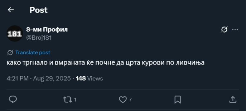 На ден 29.08.2025 година, Х корисникот „@Broj181“ на својот „Х“ профил, напиша: „како тргнало и вмраната ќе почне да црта курови по ливчиња“. Со ваквата објава, корисникот користи говор на омраза насочен кон членовите и симпатизерите на политичката партија „ВМРО – ДПМНЕ“, нарекувајќи ги „вмраната“.