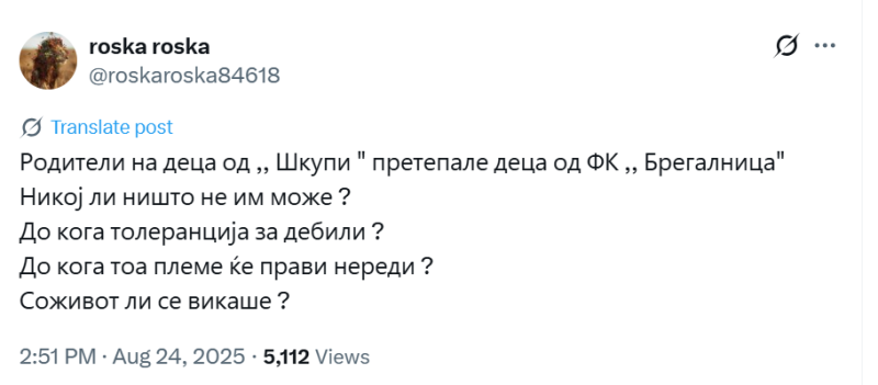 На ден 24.08.2025 година, во 14:51 часот е објавен говор на омраза врз основа на етничка припадност од твитер профилот @roskaroska84618.Во твитот пишува „Родители на деца од ,, Шкупи " претепале деца од ФК ,, Брегалница" Никој ли ништо не им може ? До кога толеранција за дебили ? До кога тоа племе ќе прави нереди ? Соживот ли се викаше?“.