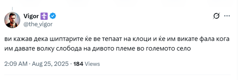 На ден 25.08.2025 година, во 14:09 часот е нотиран е говор на омраза поради етничка припадност од твитер профилот @the_vigor. Во твитот пишува „ви кажав дека шиптарите ќе ве тепаат на клоци и ќе им викате фала кога им давате волку слобода на дивото племе во големото село“.