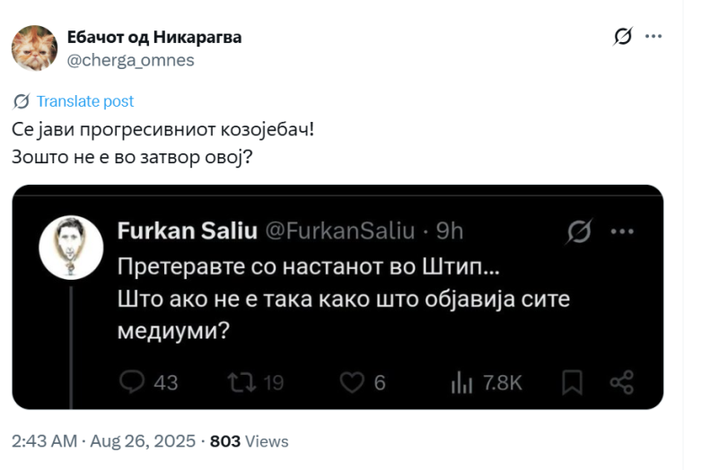 На ден 26.08.2025 година, во 14:43 часот, објавен е говор на омраза врз основа на етничка припадност од Х профилот @cherga_omnes. Во твитот пишува „Се јави прогресивниот козојебач! Зошто не е во затвор овој?“.