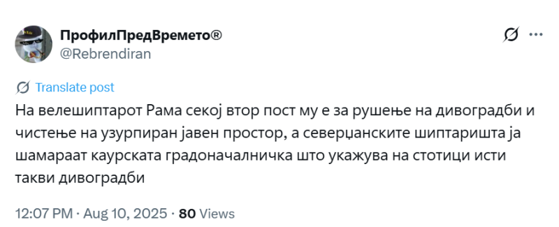 На ден 10.08.2025 година, во 12:07 часот, објавен е говор на омраза врз основа на етничка припадност и национална припадност од профилот @Rebrendiran. На пост поврзан со дивоградбите во Чаир, тој пишува „На велешиптарот Рама секој втор пост му е за рушење на дивоградби и чистење на узурпиран јавен простор, а северџанските шиптаришта ја шамараат каурската градоначалничка што укажува на стотици исти такви дивоградби“.