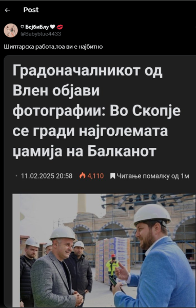 Бејбиблу постира вест дека градоначалникот од влен објавил фотографии дека во скопје ке се гради најголемата џамија на балканот со коментар, "Шиптарска работа,тоа ви е најбитно "
