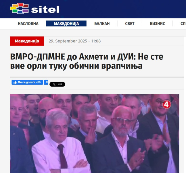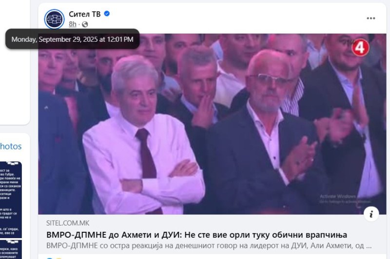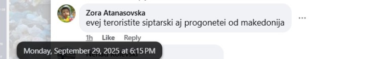 На ден 29.09.2025 година, националната телевизија „Сител“, на својата веб страна, објави вест насловена како: „ВМРО-ДПМНЕ до Ахмети и ДУИ: Не сте вие орли туку обични врапчиња“. Истата вест ја објави и на својот фејсбук профил „Сител ТВ“. Во коментар, под објавената вест на фејсбук, корисникот „Zora Atanasovska“ коментира: „евеј терористите шиптарски ај прогонете ги од македонија“. Со ваквиот коментар, корисникот користи говор на омраза насочен кон албанското население.
