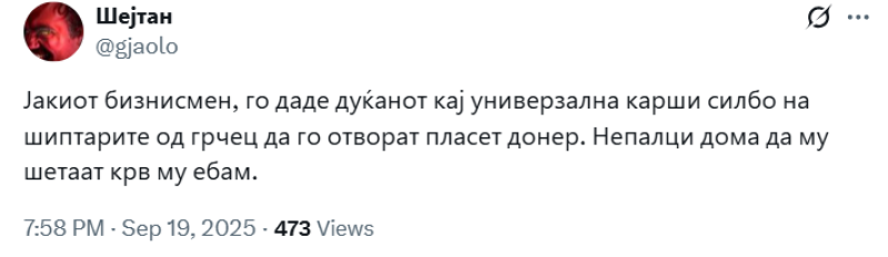 На ден 19.09.2025 година во 19:58 часот, од Х профилот @gjaolo e забележан е говор на омраза поради етничка припадност. Авторот во коментар пишува „Јакиот бизнисмен, го даде дуќанот кај универзална карши силбо на шиптарите од грчец да го отворат пласет донер. Непалци дома да му шетаат крв му ебам“.