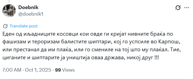 На ден 01.10.2025 година, во 07:00 часот, објавен е говор на омраза врз основа на етничка припадност и социјално потекло од X профилот @doebnik1. Во твитот пишува „Еден од иљадниците косовци кои овде ги кријат нивните браќа по фашизам и тероризам балистите шиптари, кој го успсиле во Карпош, или престанал да им плаќа, или го смениле на тој што му плаќал. Тие, циганите и шиптарите ја уништија оваа држава, никој друг!!!“.