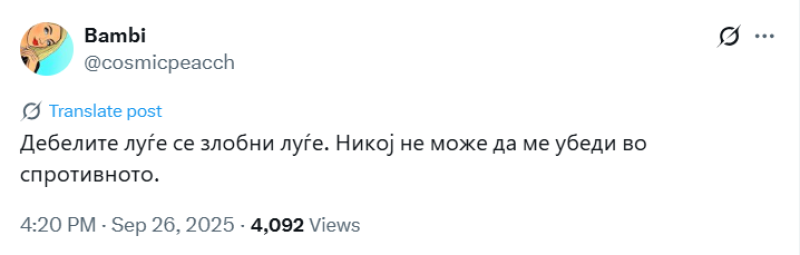 На ден 26.09.2025 година, во 16:20 часот, објавен е говор на омраза врз основа на здравствена состојба од Х профилот @cosmicpeacch. Во твитот пишува „Дебелите луѓе се злобни луѓе. Никој не може да ме убеди во спротивното“.
