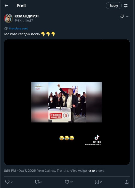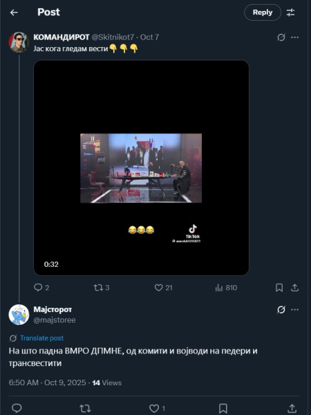 На ден 07.10.2025 година, Х профилот „@Skitnikot7“, на својот Х профил, објави видео од тик ток, кое е исечок од видео подкастот на Бојан Јовановски, познат во јавноста како „Боки – 13“, во кое тој, на голем екран, прикажува слики од настапи на претседателот на СДСМ, Венко Филипче, притоа коментирајќи го со погрдни зборови и навреди. Во прилог на објавата, Х корисникот напиша: „Јас кога гледам вести“. Во коментар, под објавата, Х корисникот „@majstoree“ коментира: „На што падна ВМРО ДПМНЕ, од комити и војводи на педери и трансвестити“. Со ваквиот коментар, корисникот користи говор на омраза насочен кон припадниците на LGBTQ+ заедницата.