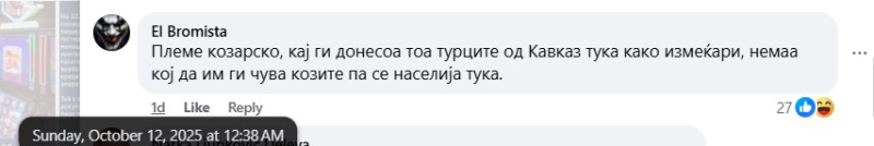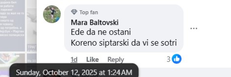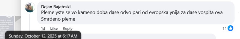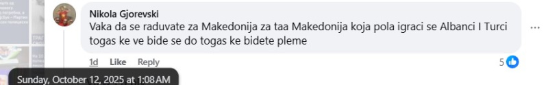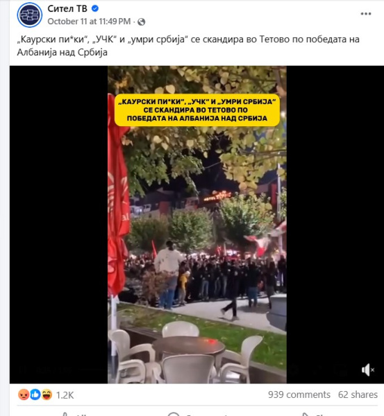 На ден 11.10.2025 година, националната телевизија „Сител“, на својот фејсбук профил „Сител ТВ“, објави видео на кое се гледа поголема група луѓе од албанска националност како скандираат навредливи навивачки пароли. Во прилог на објавеното видео, напиша: „„Каурски пи*ки“, „УЧК“ и „умри србија“ се скандира во Тетово по победата на Албанија над Србија“. Во коментар, под објавеното видео, фејсбук корисникот „Marijan Arsovski“ коментира: „Диво племе шовинистичко“. Корисникот „El Bromista“ коментира: „Племе козарско, кај ги донесоа тоа турците од Кавказ тука како измеќари, немаа кој да им ги чува козите па се населија тука.“. Корисникот „Gabi Angelovska“ напиша: „Ццц се срамам што потекнувам од таква држава, овие не се народ туку СТОКА“. Корисникот „Dejan Rajatoski“ коментира: „Племе уште се во камено доба да се одвои пари од европска унија за да се воспита овоа смрдено племе“. Корисникот „Naum Jonoski“ напиша: „Цркнете уште не ви иде памет вие сте некое племе“. Корисникот „Nikola Gjorevski“ коментира: „Вака да се радувате за Македонија за таа Македонија која пола играчи се Албанци и Турци тогаш ќе ве биде се до тогаш ќе бидете племе“. Корисникот „Mileva Talevska“ коментира: „Кои се овие животни да им се сотри племето“. Корисникот „Mara Baltovski“ напиша: „Еден да не остани. Корено шиптарски да ви се сотри“. Корисникот „Saso Gjorgjiev“ напиша: „Диво племе“. Сите корисници користат говор на омраза насочен кон албанското население.