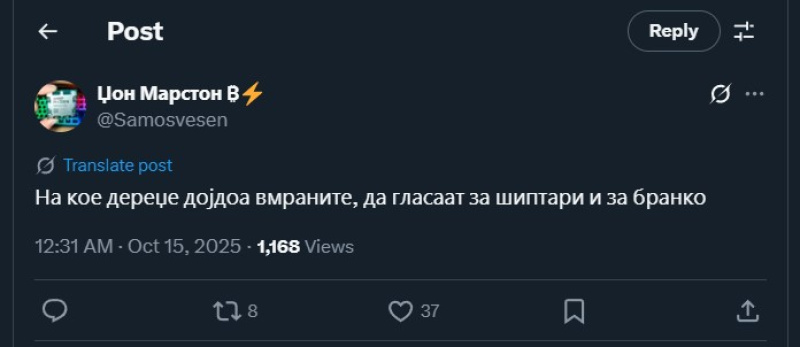 На ден 15.10.2025 година, Х профилот „@Samosvesen“ на својот Х профил, напиша: „На кое дереџе дојдоа вмраните, да гласаат за шиптари и за бранко“. Со ваквата објава, корисникот користи говор на омраза насочен кон членовите и симпатизерите на политичката партија „ВМРО – ДПМНЕ“, како и кон албанското население.