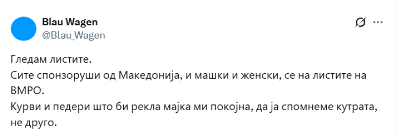 На ден 07.10.2025 година, во 09:55 часот, објавен е говор на омраза врз основа на политичка припадност, сексуална ориентација и родов идентитет и пол и род од Х профилот @Blau_Wagen. Авторот пишува „Гледам листите. Сите спонзоруши од Македонија, и машки и женски, се на листите на ВМРО. Курви и педери што би рекла мајка ми покојна, да ја спомнеме кутрата, не друго“.