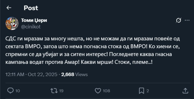 На ден 22.10.2025 година, Х корисникот „@cinikot“, на својот Х профил, напиша: „СДС ги мразам за многу нешта, но не можам да ги мразам повеќе од сектата ВМРО, затоа што нема погнасна стока од ВМРО! Ко хиени се, спремни се да убијат и за ситен интерес! Погледнете каква гнасна кампања водат против Амар! Какви мрши! Стоки, племе..!“. Со ваквата објава, корисникот користи говор на омраза насочен кон членовите и симпатизерите на политичката партија „ВМРО – ДПМНЕ“.