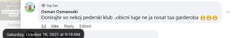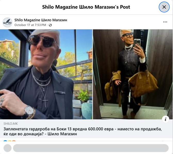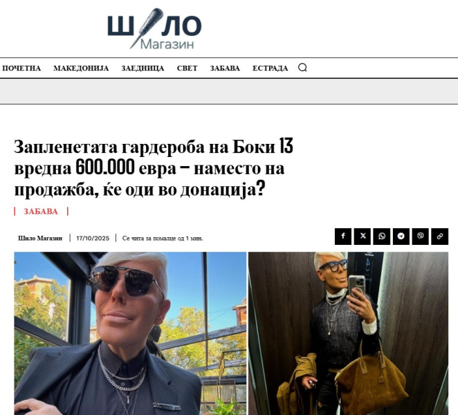 На ден 17.10.2025 година, интернет порталот „Шило Магазин“, на својата веб страна, објави вест насловена како: „ Запленетата гардероба на Боки 13 вредна 600.000 евра – наместо на продажба, ќе оди во донација?“ Истата вест ја објави и на својата фејсбук страна „Shilo Magazine – Шило Магазин“. На ден 18.10.2025 година, во коментар под објавата, корисникот „Osman Osmanoski“ коментира: „Донирајте во некој педерски клуб, обични луѓе не ја носат таа гардероба“. Корисникот „Edi Salifoski“ коментира: „Педеркиши“. Корисникот „Oli Kiki Lozan“ напиша: „Ако те видам, цел ќе те препарирам педериште гадно“. На ден 20.10.2025 година, корисникот „Albena Trpkoska“ коментира: „Кој ќе купи кој ќе носи таква со извинение педерска облека? Со ваквите коментари, корисниците користат говор на омраза насочен кон припадниците на геј заедницата.