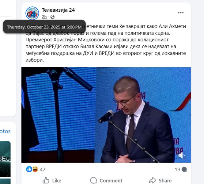 На ден 23.10.2025 година, националната телевизија „Телевизија 24“, на својот фејсбук профил „Телевизија 24“ објави видео прилог во однос на политичките препукувања меѓу коалиционите партнери во владеачката структура, а видеото е пропратено со текст кој гласи: „Сите кои се занимваат со етнички теми ќе завршат како Али Ахмети од Зајас од длабок пораз и голема пад на политичката сцена. Премиерот Христијан Мицковски со порака до колациониот партнер ВРЕДИ откако Билал Касами изјави дека се надеваат на меѓусебна поддршка на ДУИ и ВРЕДИ во вториот круг од локалните избори.“. Во коментар, под објавеното видео, корисникот „Драги Филиповски“ коментира: „Шиптар е шиптар прсти да му дадеш рака ќе ти однесат и се им е малку“. Со ваквиот коментар корисникот користи говор на омраза насочен кон албанското население.