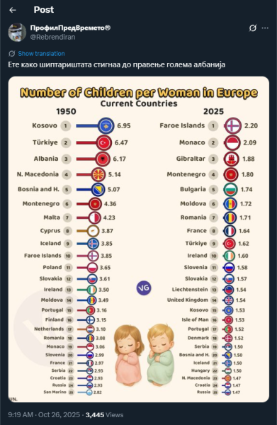 На ден 26.10.2025 година, Х корисникот „@Rebrendiran“, на својот Х профил, објави слика од статистикчки податок со кој е претставен бројот на деца која една жена ги раѓа во Европа. Во прилог на објавената слика, корисникот напиша: „Ете како шиптариштата стигнаа до правење голема албанија.“ Со ваквата објава, корисникот користи говор на омраза насочен кон албанското население.
