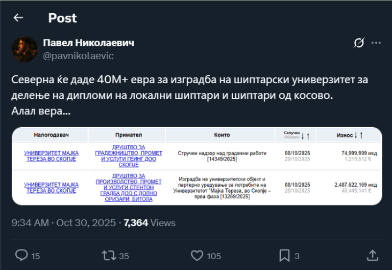 На ден 30.10.2025 година, Х корисникот „@pavnikolaevic“, на својот Х профил, објави слика од доделени тендери од страна на Универзитет Мајка Тереза од Скопје кон две градежни фирми за изведба на одредени градежни активности. Во прилог на објавената слика, корисникот напиша: „Северна ќе даде 40М+ евра за изградба на шиптарски универзитет за делење на дипломи на локални шиптари и шиптари од косово. Алал вера...“. Со ваквата објава, корисникот користи говор на омраза насочен кон албанското население.