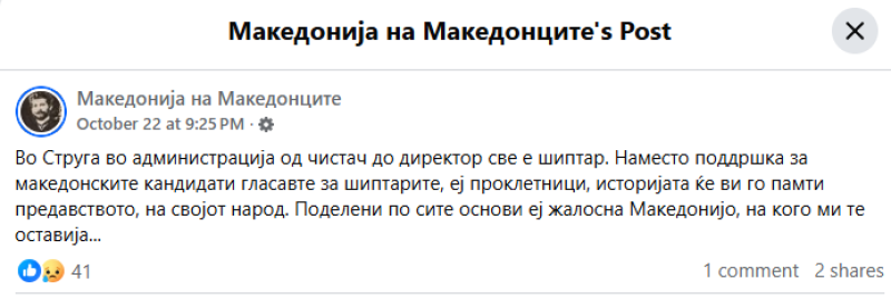 На ден 22.10.2025 година, во 21:25 часот, регистриран е говор на омраза поради етничка припадност од Фејсбук профилот Македонија на Македонците. Во постот пишува „Во Струга во администрација од чистач до директор све е шиптар. Наместо поддршка за македонските кандидати гласавте за шиптарите, еј проклетници, историјата ќе ви го памти предавството, на својот народ. Поделени по сите основи еј жалосна Македонијо, на кого ми те оставија..“.