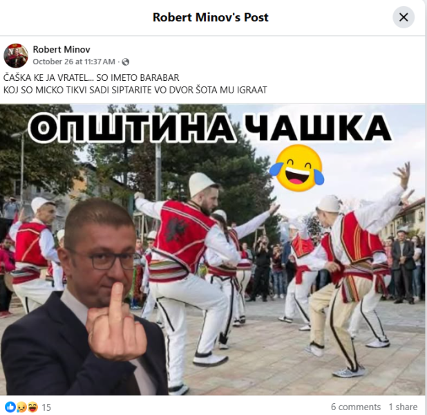 На ден 26.10.2025 година во 11:37 часот, од Фејсбук профилот Robert Minov сe објавени навредливи фотомонтажа и текст. Во текстот пишува „Чашка ќе ја врател со името барабар. Кој со Мицко тикви сади шиптарите во двор шота му играат“.