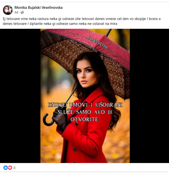 Во постот пишува „Еј тетоваре врне нека растура нека ги однесе сите тетовари денес вршеше цел ден во Скопје и вчера, а денес тетовара и шиптарите нека ги однесе само нека не остават на мира“.