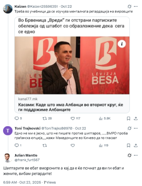 На ден 23.10.2025 година, во 06:59 часот, објавен е говор на омраза врз основа на етничка припадност и политичка припадност од Х профилот @frank_furt567. Во коментар пишува „ Шиптарите ве ебат вмороните а кај да е ќе почнат да ви ги ебат и жените, вибам ретардите!“.
