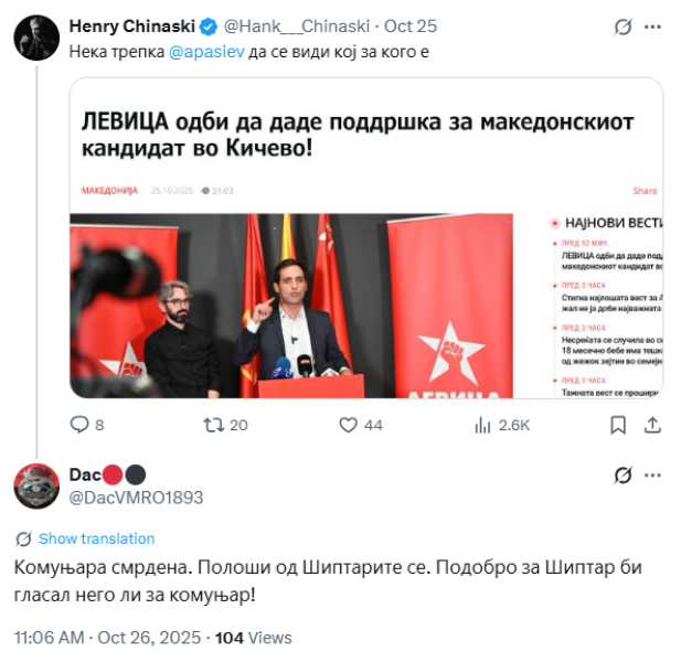 На ден 26.10.2025 година, во 11:06 часот, објавен е говор на омраза врз основа на политичка припадност и етничка припадност од Х профилот @dacVMRO1893. Во коментар пишува „Комуњара смрдена. Полоши од Шиптарите се. Подобро за Шиптар би гласал него ли за комуњар!“.