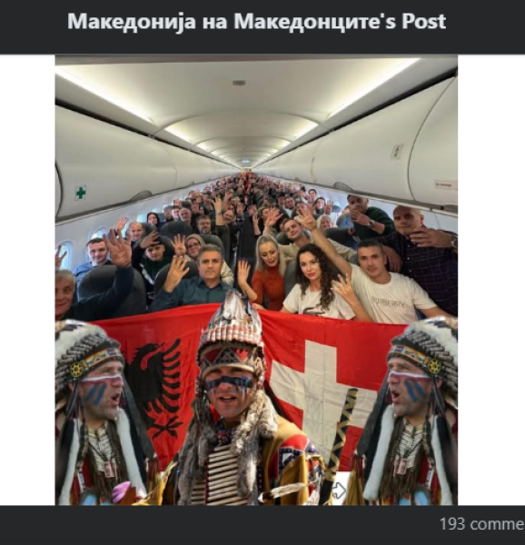 Фејсбук страницата Македонија на Македонците обајвува слика од албанците гласачи кои патуваат со авион за да гласаат. На сликата фотошопирани индијански костими.