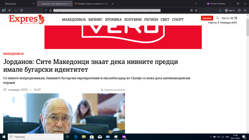 За него, најстрашното достигнување на мaкедонската политика е тоа што успеала да подели еден народ. „Еден татко не може да создаде два народа“, метафорично вели Јорданов. „Сите Македонци знаат дека нивните предци имале бугарски идентитет“.