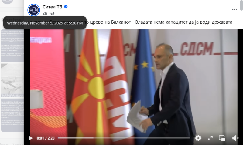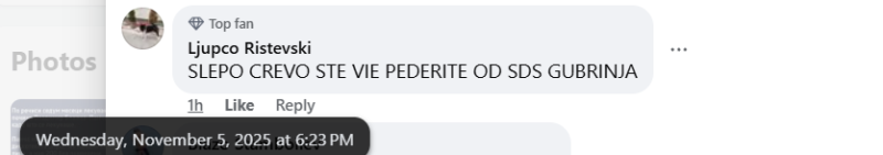На ден 05.11.2025 година, националната телевизија „Сител“, на својот фејсбук профил „Сител ТВ“, објави видео од прес - конференција на претседателот на СДСМ, Венко Филипче. Во коментар, под објавеното видео, корисникот „Ljupco Ristevski“ коментира: „ СЛЕПО ЦРЕВО СТЕ ВИЕ ПЕДЕРИТЕ ОД СДС ЃУБРИЊА“. Со ваквиот коментар, корисникот користи говор на омраза насочен кон припадниците на геј заедницата.